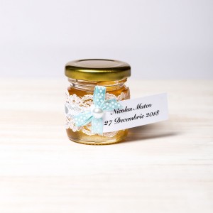 Fie ca petrecerea de botez este una de primavara sau de toamna, marturiile tratatii dulci cu decor manual sunt intotdeauna in tendinte. Borcanelele decorate cu dantela alba si fundita bleu cu buline albe sunt ideale pentru prima petrecere din viata unui baietel vesel, cu ochi albastri.