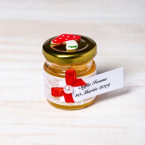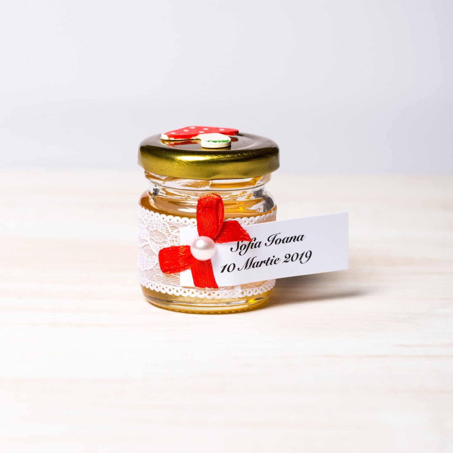 Marturiile tratatii dulci sunt foarte apreciate de invitati, mai ales daca gustarea oferita este aromata si sanatoasa. Marturiile borcanele miere cu dantela alba si accesorii rosii sunt adecvate pentru botezul unei fetite.