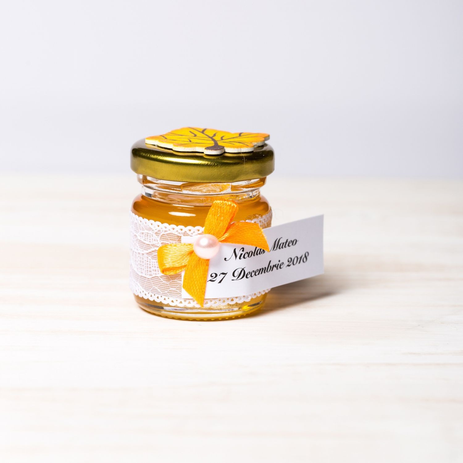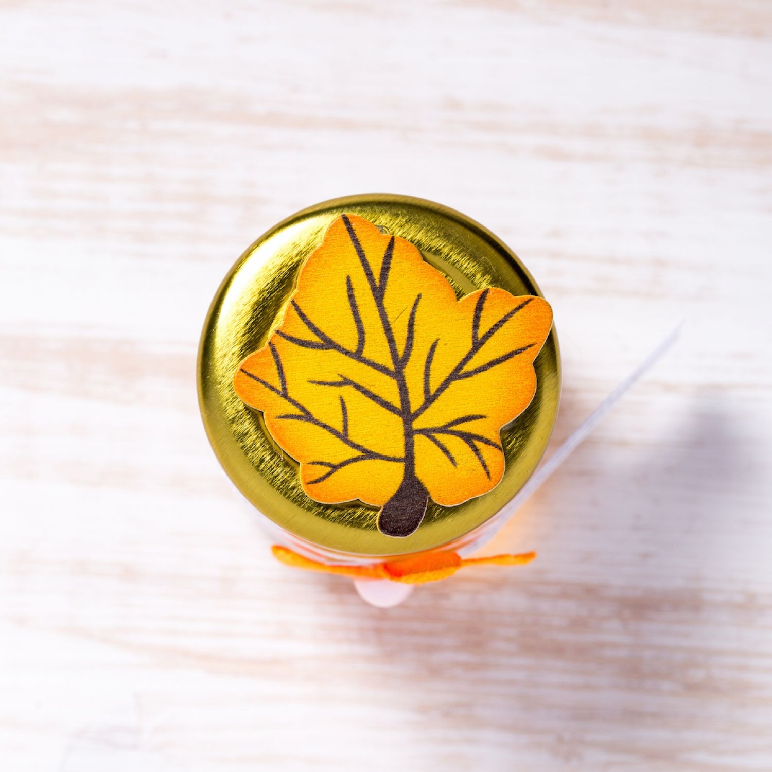 Marturiile borcanele miere decorate festiv cu o figurina in forma de frunza pe capac sunt sugestive pentru un botez programat toamna. Acestea sunt decorate manual cu banda alba din dantela, fundita portocalie si jumatate de perla.