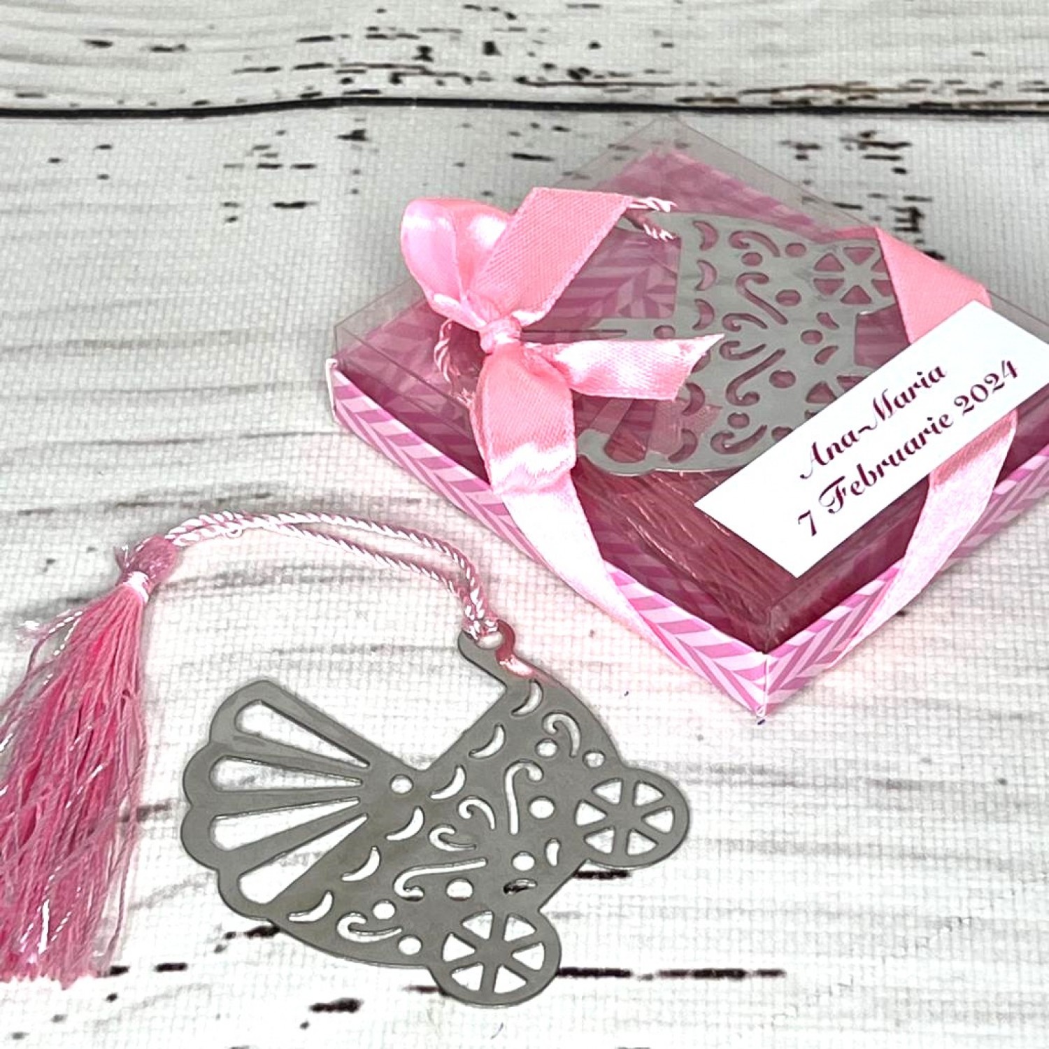 Marturiile semn de carte carucior cu snur roz sunt acele obiecte utile, de mici dimensiuni care pot fi folosite atunci cand citesti o carte si vrei sa lasi un semn la pagina la care ai ramas, fara sa indoi coltul paginii.