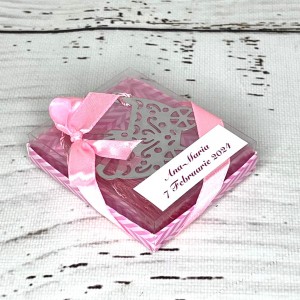 Frumoasele cadouri oferite invitatilor prezenti la botez sunt fabricate din metal nichelat de culoare argintie si ambalate in cutiute din carton roz cu capac transparent.