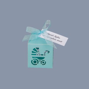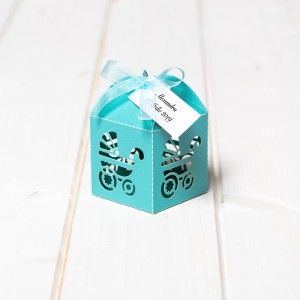 Micile marturii cutiute din carton bleu au baza patrata si se asambleaza usor. Modelul grafic in forma de carucior este realizat prin tehnica laser cut.