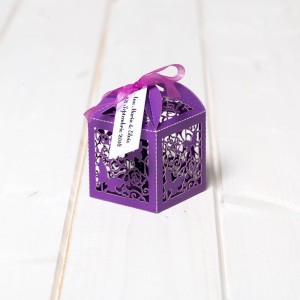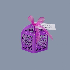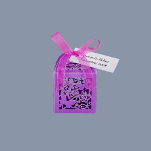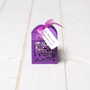 Dupa asamblare, marturiile se umple cu bomboane, apoi se leaga in varf cu o fundita mov din organza. Cutiutele au baza patrata.
