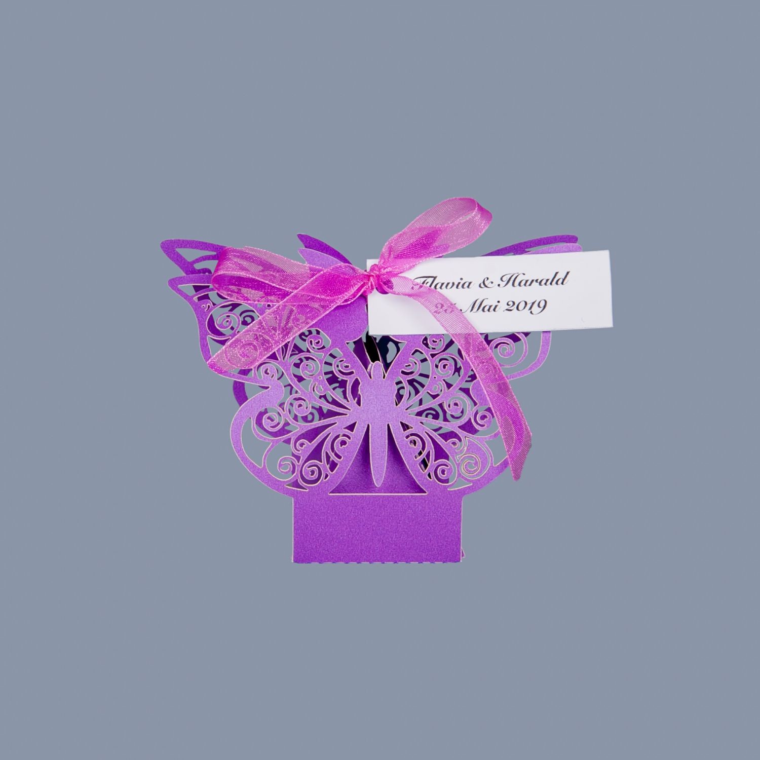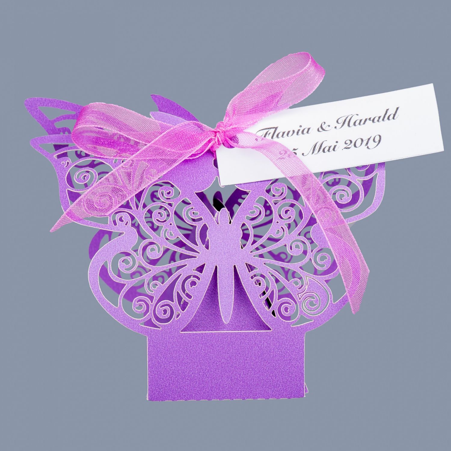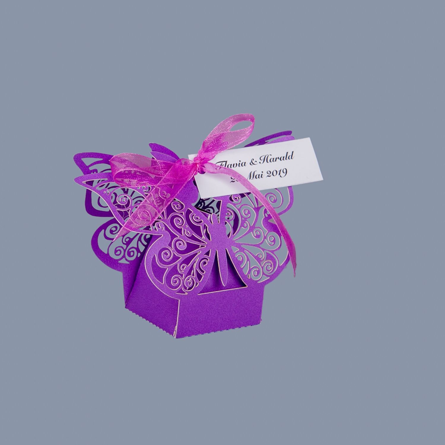 Marturiile cutiutele fluture mov sunt realizate din carton si au decupaj fluturi obtinuit prin tehnica laser cut.