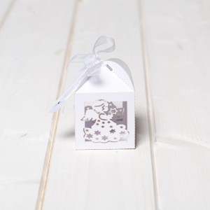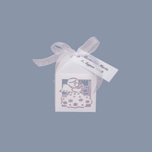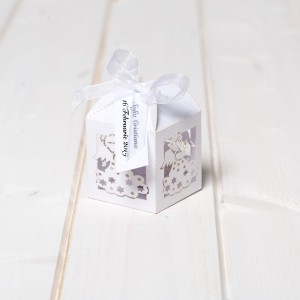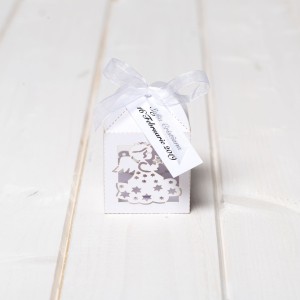 Daca albul imaculat poate fi asociat cu rochia miresei, dar si cu decorul din sala de receptie (pahare miri, casuta dar), ingerasul de pe cutie este atat protectorul proaspetilor insuratei, cat si al invitatilor.