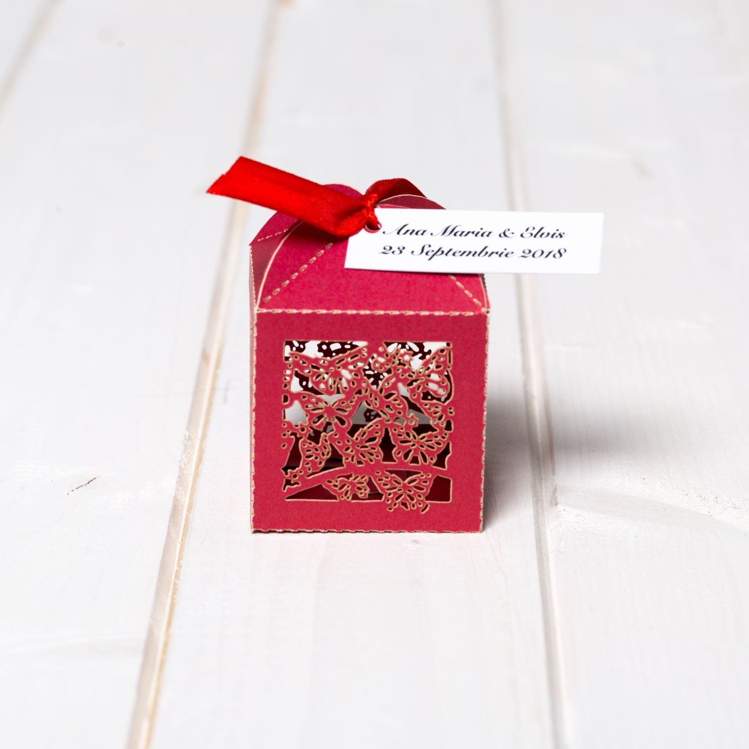 Marturiile de nunta cutiuta fluture rosu se leaga cu o fundita asortata de culoare rosie.