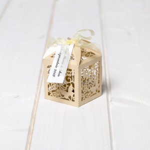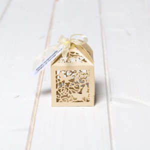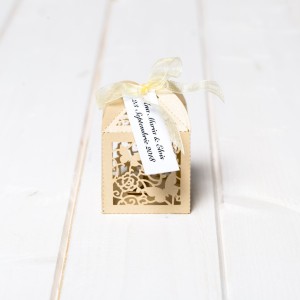 La cerere, cutiutele se pot personaliza. Personalizarea cutiutelor presupune legarea unui cartonas de fundita. Pe eticheta se imprima numele mirilor si data evenimentului.