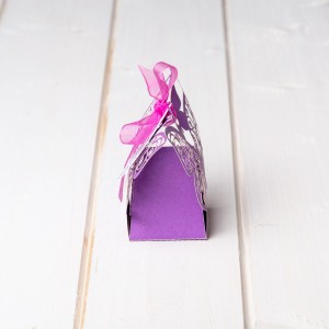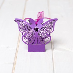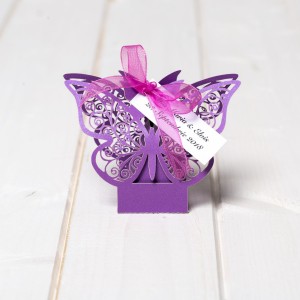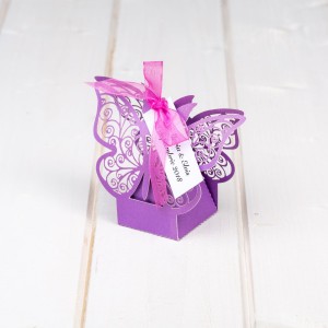 Marturiile cutiutele fluture mov sunt realizate din carton si au decupaj fluturi obtinuit prin tehnica laser cut.