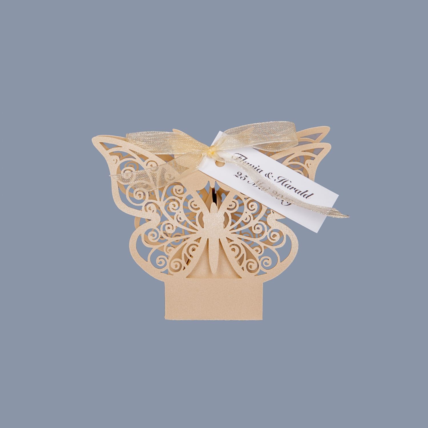 Cutiutele au baza triunghi, iar decupajul fluture este obtinut prin tehnica laser cut.