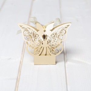 Pentru o nunta clasica sau in stil traditional la care mireasa poarta o rochie ivory, iar paharul mirilor are decor in aceasta culoare neutra, marturiile de nunta cutiute fluture oferite invitatilor pot fi cu siguranta ivory.