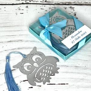 Marturiile de nunta semn de carte bufnita bleu sunt alegerea perfecta pentru nuntile cu tema Lectura.