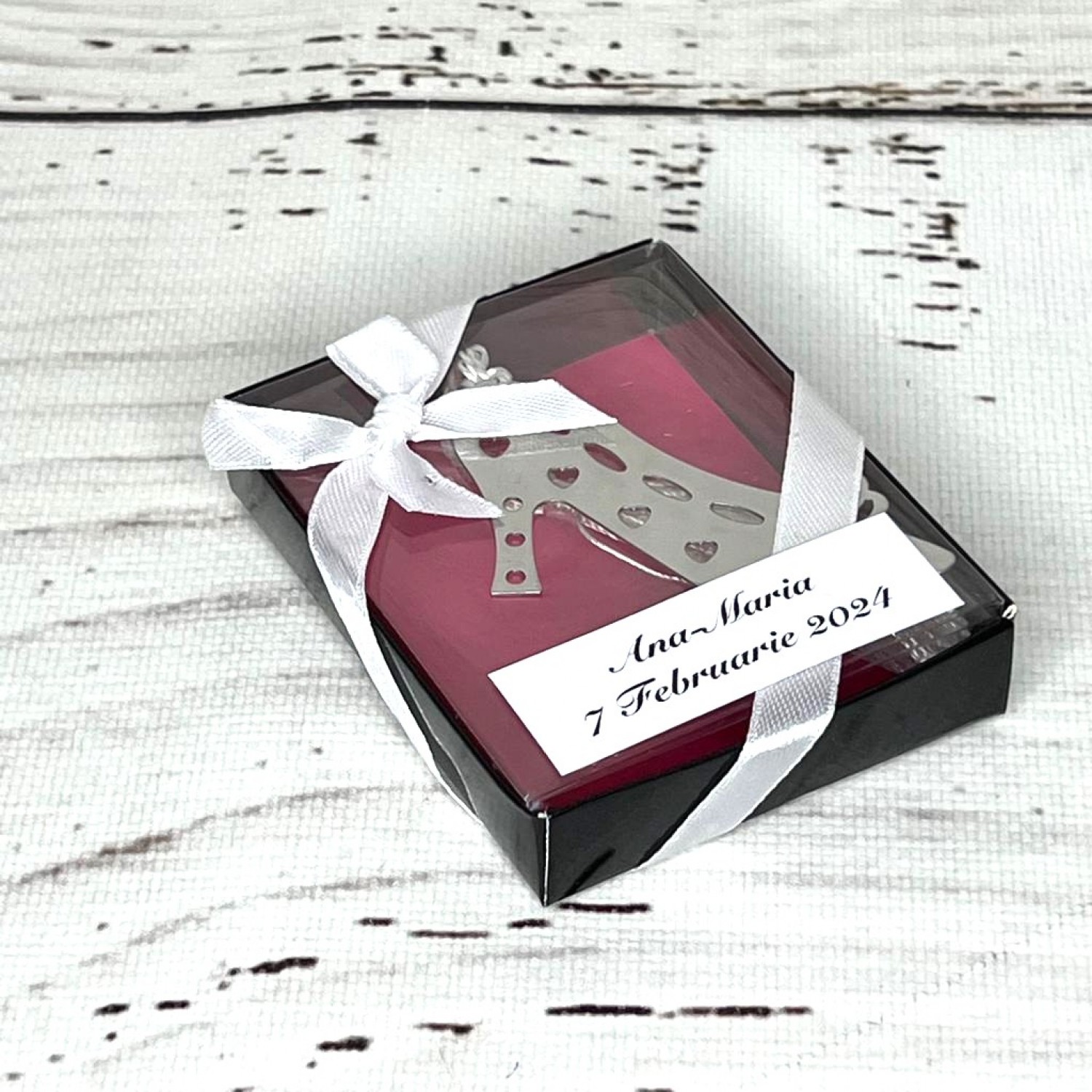 Marturiile de nunta pantof se livreaza in cutiute cu capac transparent. Optional, le poti oferi invitatilor cu eticheta pe care este mentionat numele mirilor si data evenimentului. Personalizarea este GRATUITA.