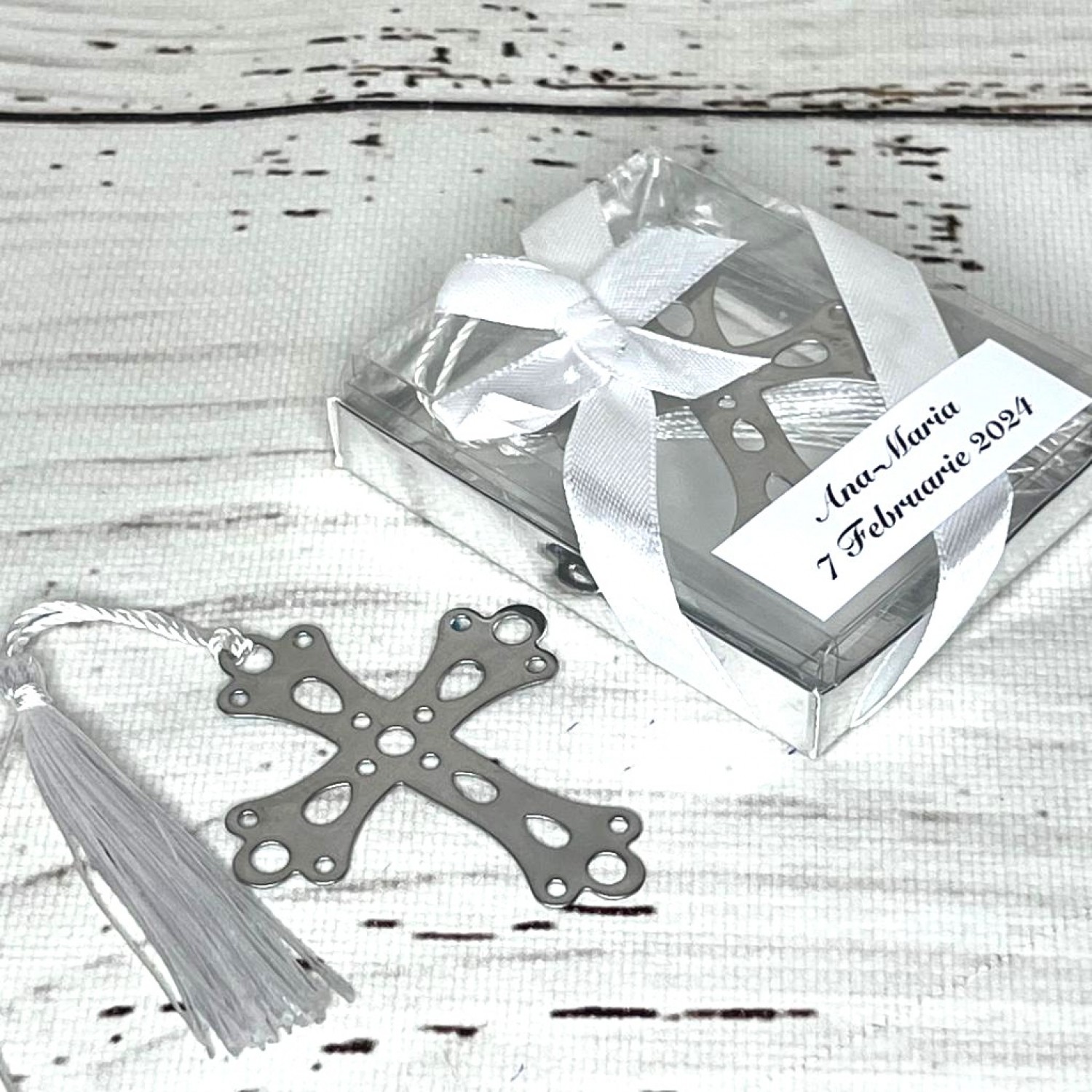 Marturiile semne de carte cruce sunt realizate din metal argintiu, mult mai rezistent decat cartonul si au la capat ciucur alb. Cruciulitele se ofera in cutii de carton cu capac de plastic transparent, pentru vizualizarea produselor.