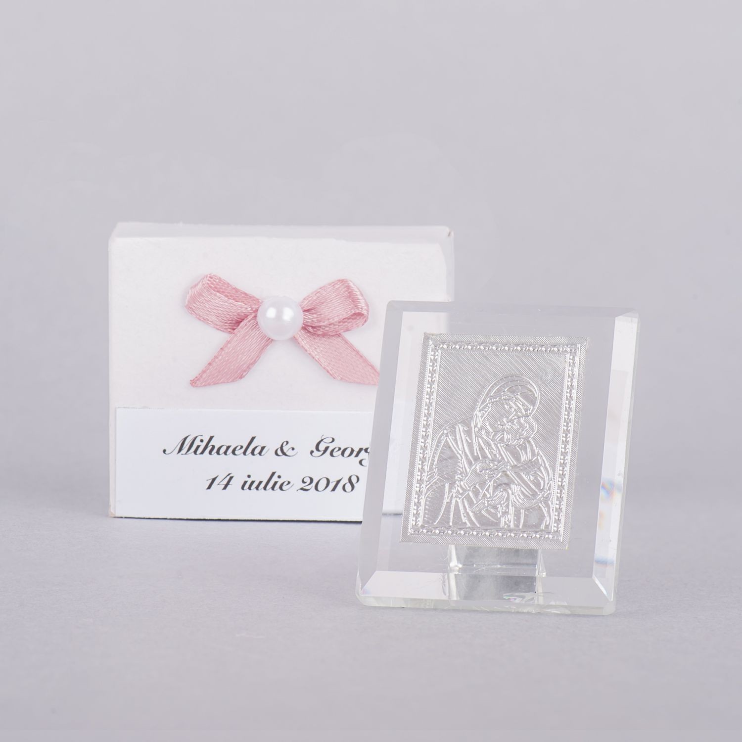 Iconita argintie in care este infatisata Fecioara Maria cu pruncul Iisus este realizata dintr-o foita subtire de aluminiu si lipita pe sticla. Aceasta se sprijina pe un suport transparent din sticla.