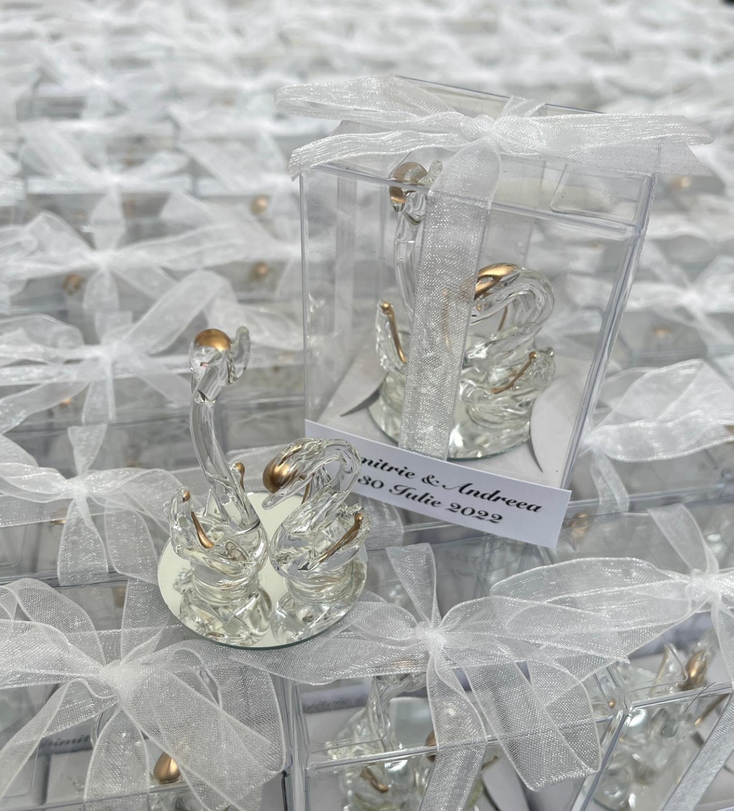Marturiile de nunta lebede din sticla sunt cadoul perfect pentru invitatii care participa la petrecerea de la restaurant. Aceste marturii pot fi daruite la un eveniment cu tema "Lacul lebedelor".