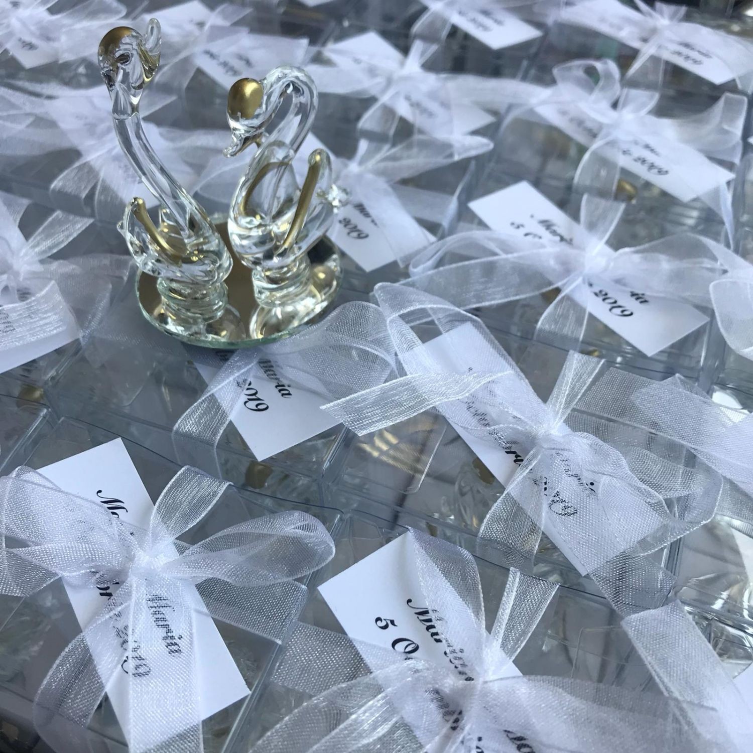 Marturiile nunta lebede se ofera personalizate cu fundita si eticheta. Pe cartonas se trece numele mirilor si data evenimentului.