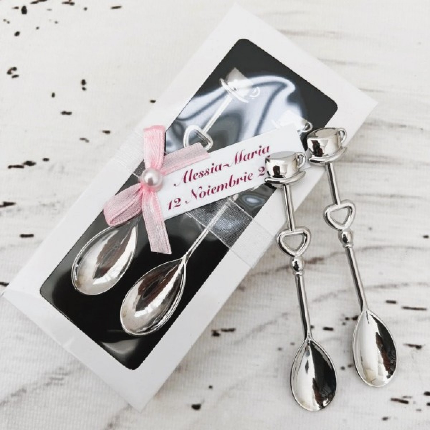 Transformă fiecare moment special într-o amintire de neuitat cu acest set elegant de lingurițe pentru cafea! Realizate din metal inoxidabil de calitate superioară, aceste lingurițe sunt un suvenir practic și rafinat pentru nunți și botezuri.