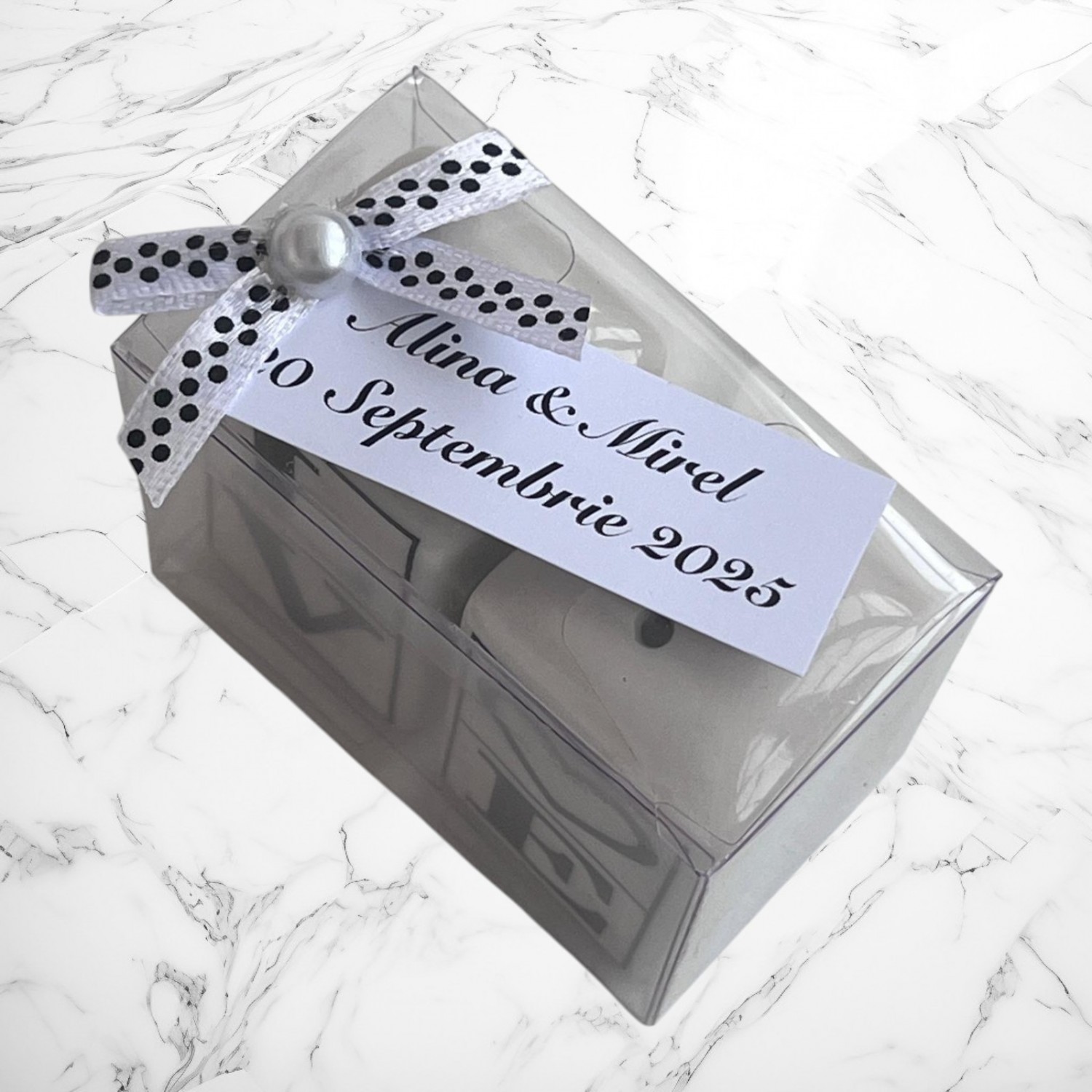 Ambalaj inclus: cutie transparentă cu fundiță și etichetă personalizabilă