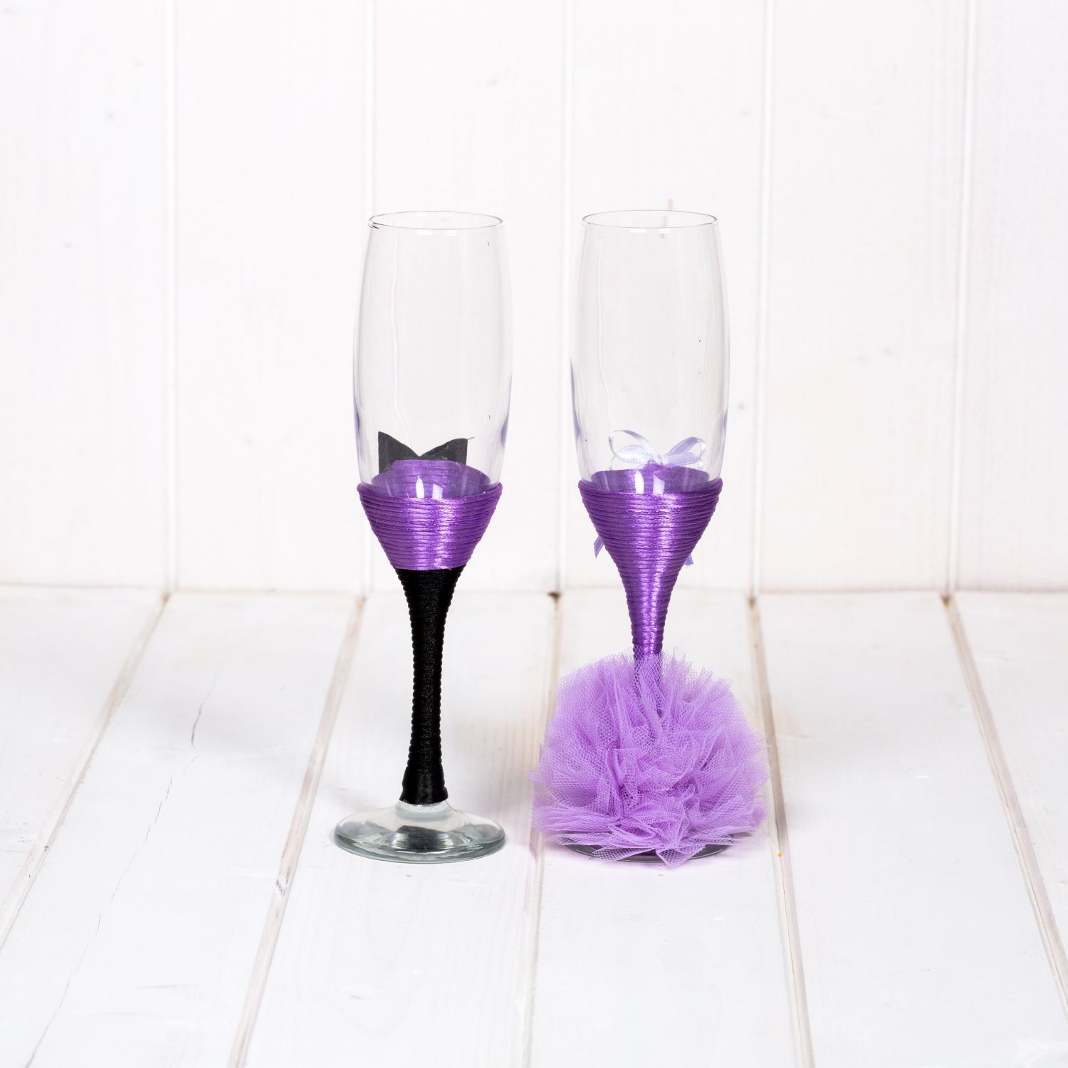 Paharul nasei este imbracat in tulle si snur de culoare lila, cu o fundita alba, iar paharul nasului este decorat cu snur negru si mov deschis, dar si cu papion negru si trei margele albe.