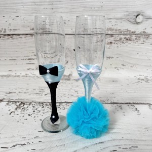 Asigura-te ca nasa va purta o rochie de nunta bleu, care se asorteaza perfect cu paharul ei de sampanie, decorat cu tulle si snur.