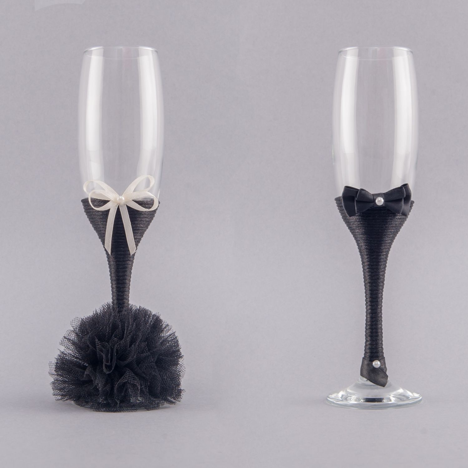 Set pahare sampanie nunta imbracate in vesminte negre, pentru a atrage atentia invitatilor la evenimentele Black-Tie si nu numai.