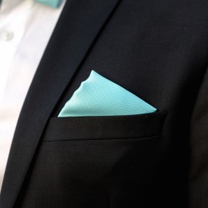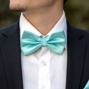 Alegand un costum de mire negru, asorteaza-l cu niste accesorii deosebite in tonuri de bleu, cum ar fi un papion butterfly cu sistem de prindere reglabil pe dimensiune, batista si butoni de camasa rotunzi.
