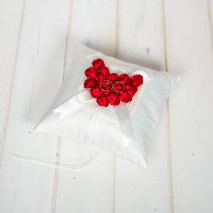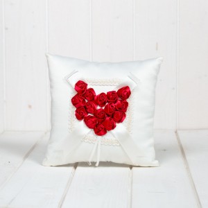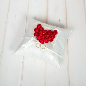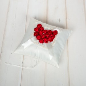 Alege pentru cununia religioasa un accesoriu delicat pentru sustinerea verighetelor, cum este pernuta verighete din tafta ivory cu trandafirasi rosii, incadrati intr-o inima.