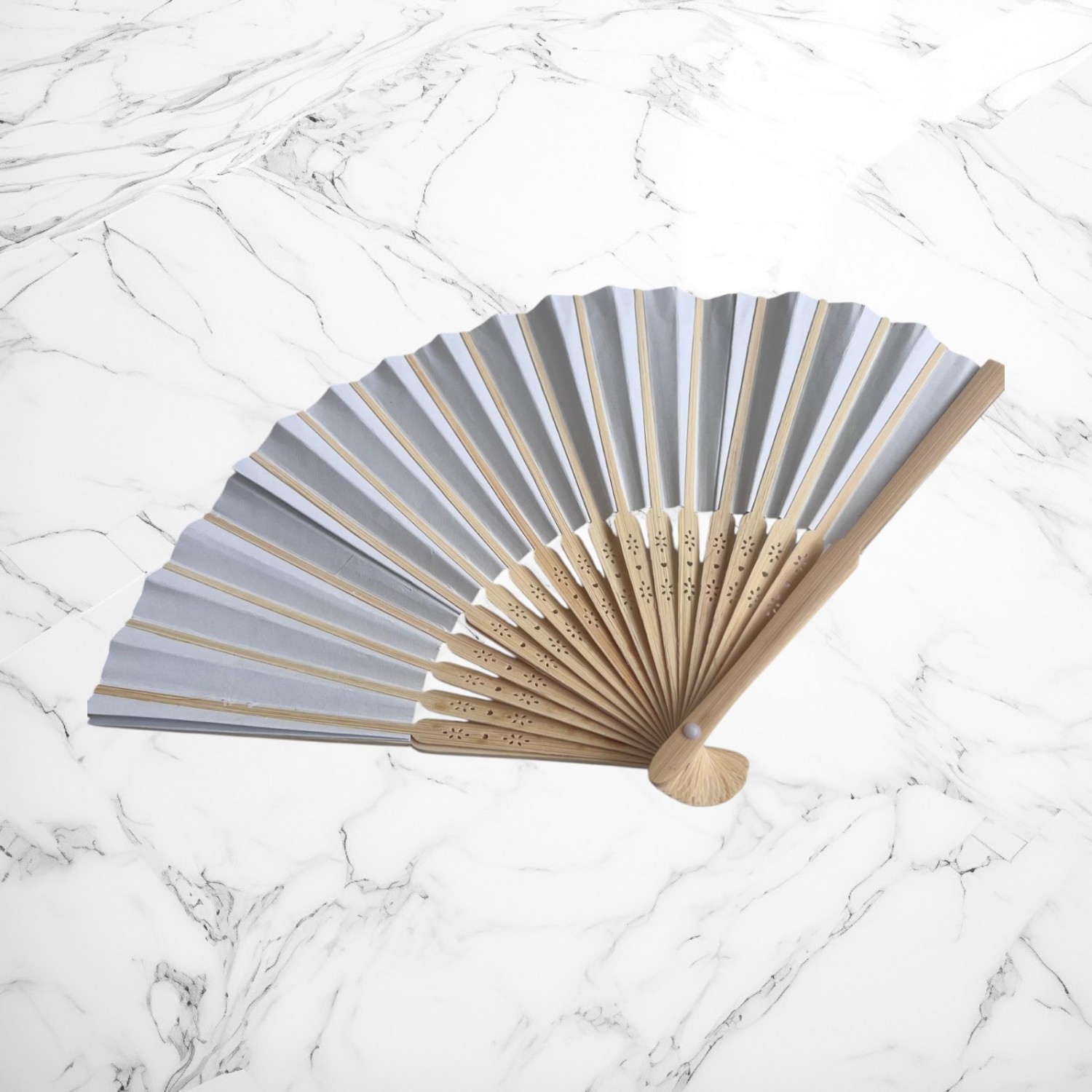 🌬️ Un evantai elegant din lemn și material alb – pentru un aer vintage rafinat