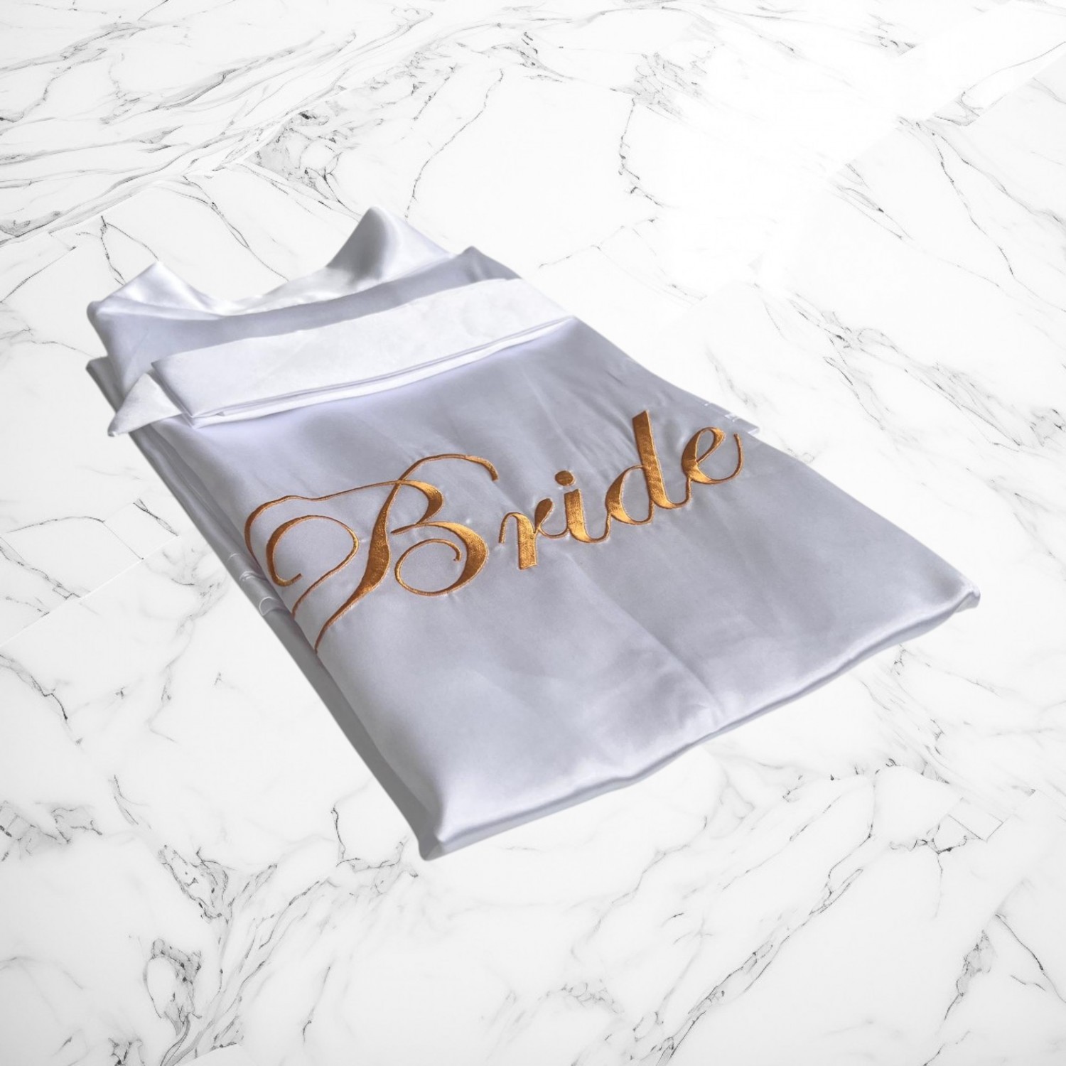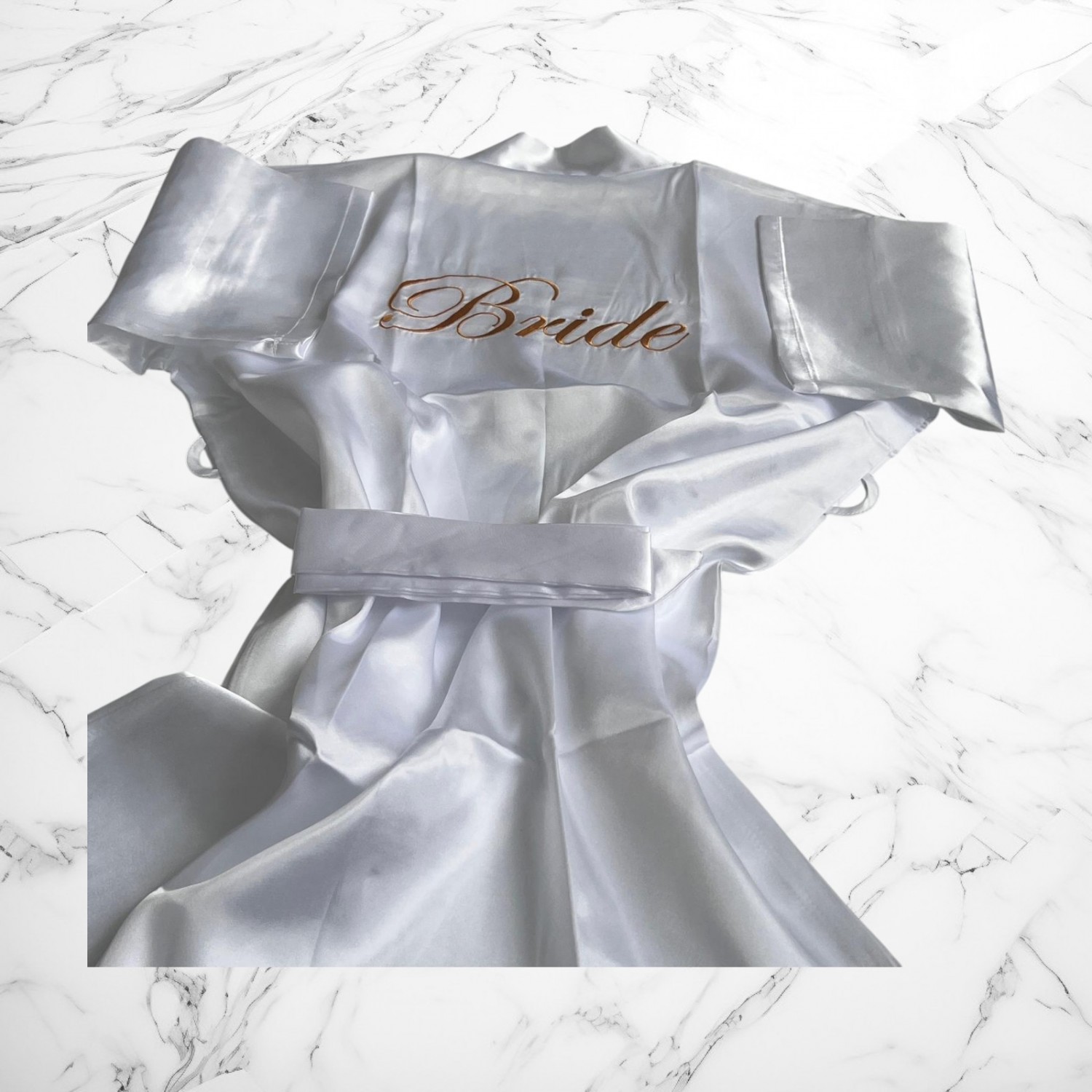 👘 Un halat alb fin, cu inscripția „Bride” – ideal pentru dimineața nunții sau ședințele foto 📸
