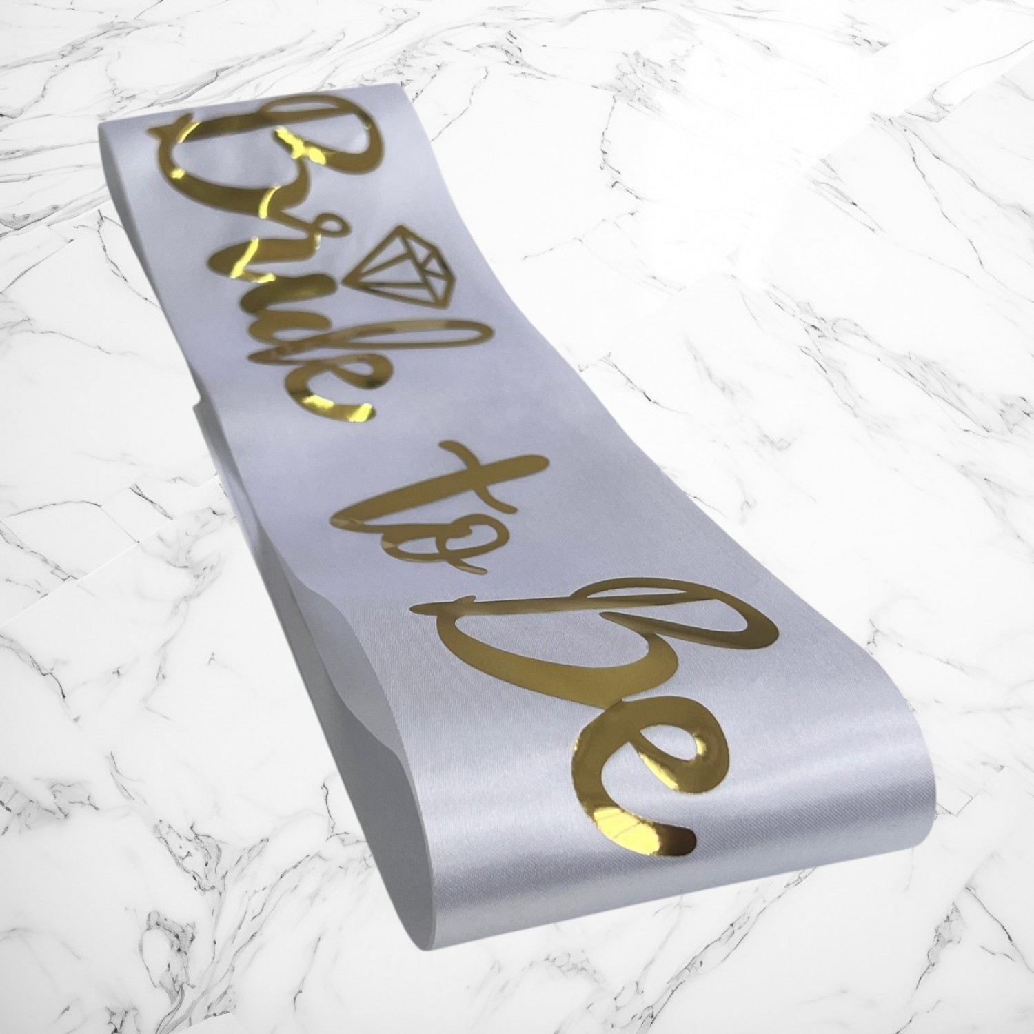 💎 O eșarfă albă din satin cu inscripția „Bride to Be” în auriu – perfectă pentru petrecerea burlăcițelor 🥂