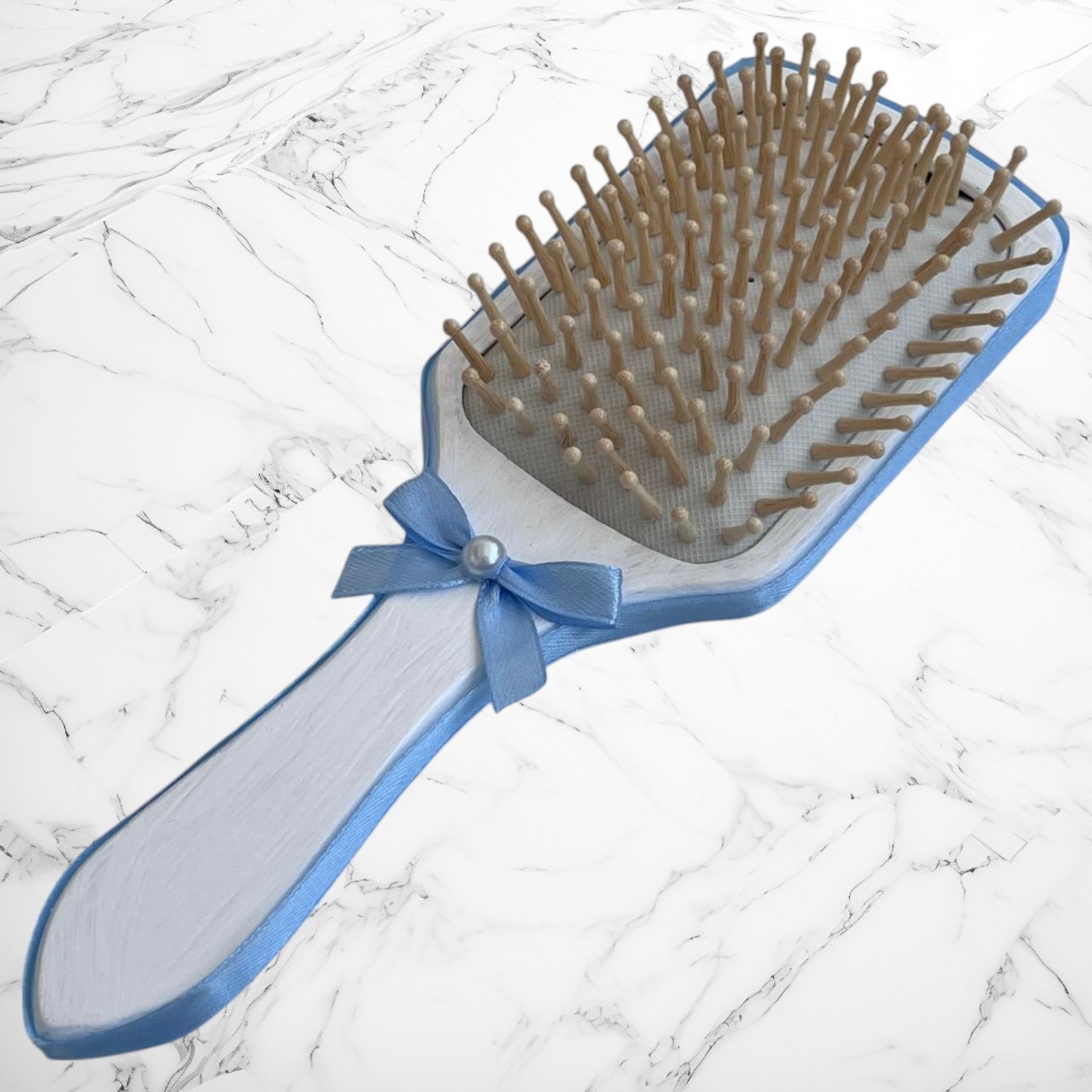 Perie de păr cu mâner din lemn, pictată în alb cu accente bleu și decorată cu o fundiță delicată, ideală pentru ultimele retușuri înainte de nuntă.