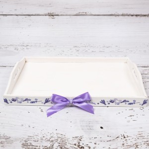 Cele patru articole care alcatuiesc acest set sunt vopsite in alb si decorate manual cu banda lavanda si fundite asortate cu perlute in mijloc.