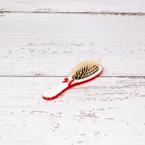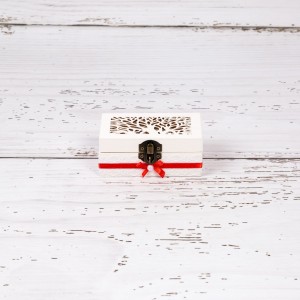 In timp ce tavita si cutia pentru verighete au o banda din dantela, peria de par si oglinda sunt decorate cu o banda rosie satinata. In plus, toate articolele din set au fundita rosie cu perluta alba in mijloc.