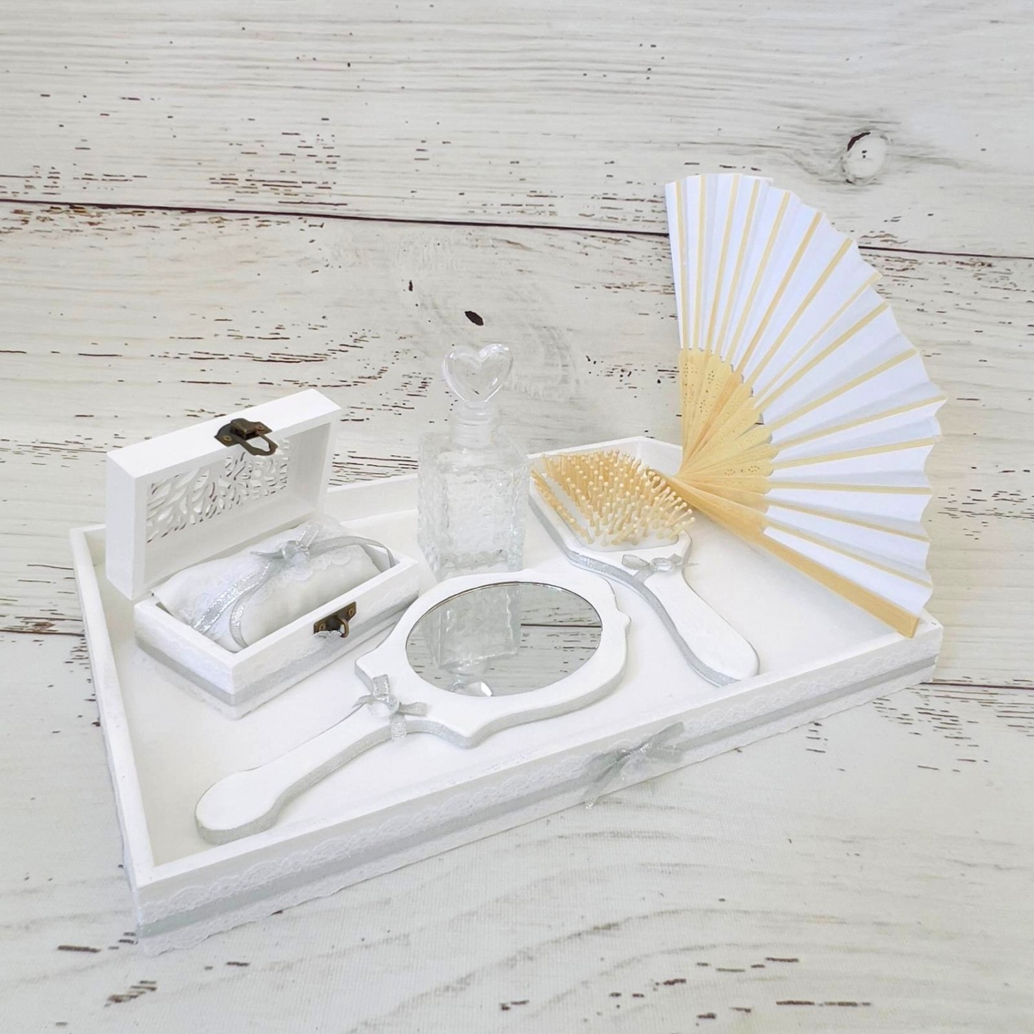 Setul tăviță pentru gătitul miresei este un ansamblu elegant și complet, conceput special pentru ziua nunții tale. Acest set conține o gamă de accesorii esențiale pentru o mireasă rafinată: