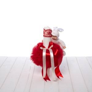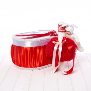 Pentru botezul unei fetite, parintii siprituali ai micutei pot comanda un set rosu biserica format din cutie trusou ovala imbracata in satin, cu panglica asortata pe capac si lumanare botez imbracata in tulle rosu, cu o jucarie bebelus atasata.