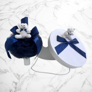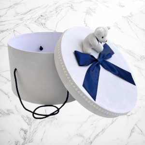 ✨ Cutie trusou – rotundă, de culoare albă, cu un diametru de 33 cm și o înălțime de 20 cm, decorată cu detalii rafinate și un ursuleț drăgălaș, ideală pentru păstrarea amintirilor prețioase.