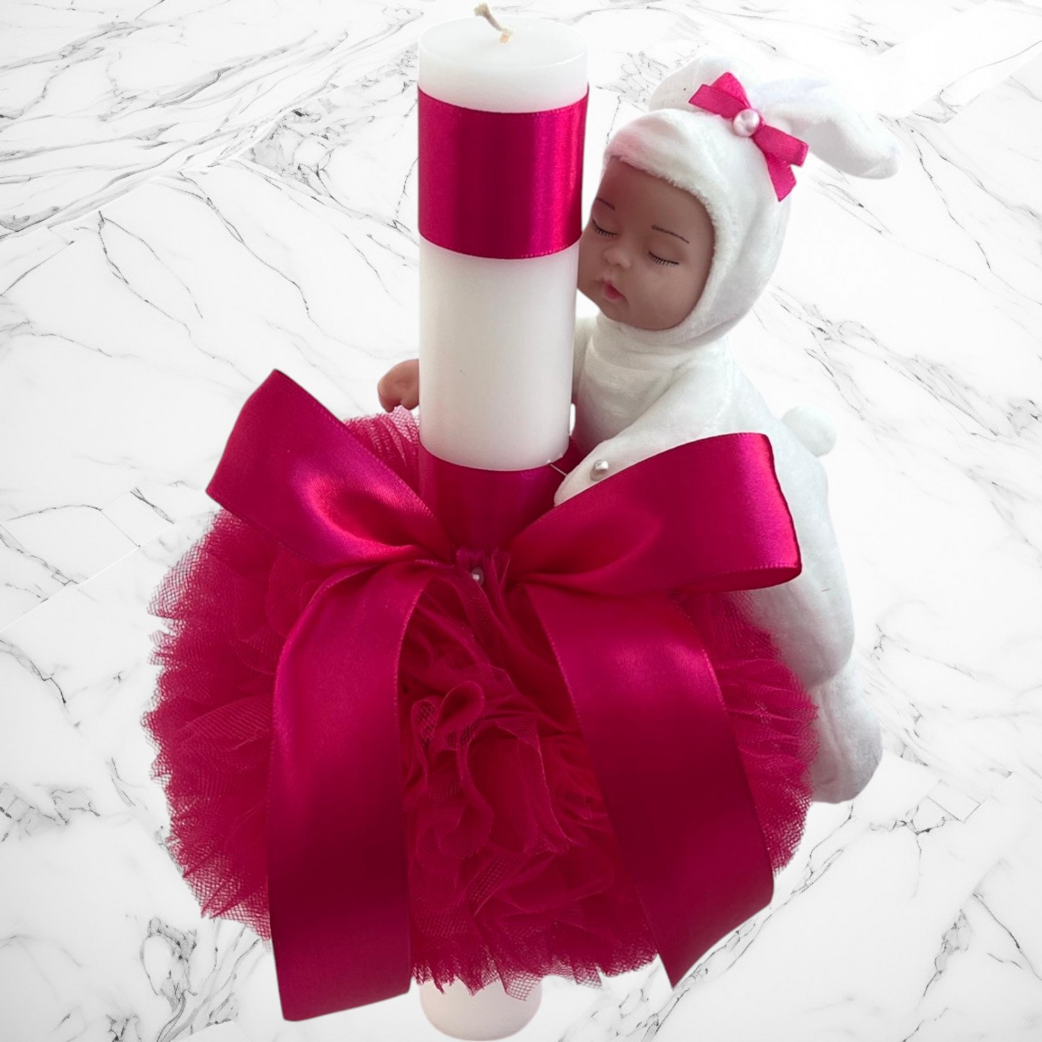 🕯️ Lumânare de botez – cu o înălțime de 35 cm și un diametru de 4.5 cm, împodobită manual cu bujori artificiali, dantelă și panglici delicate, simbolizând puritatea și frumusețea acestui moment unic.