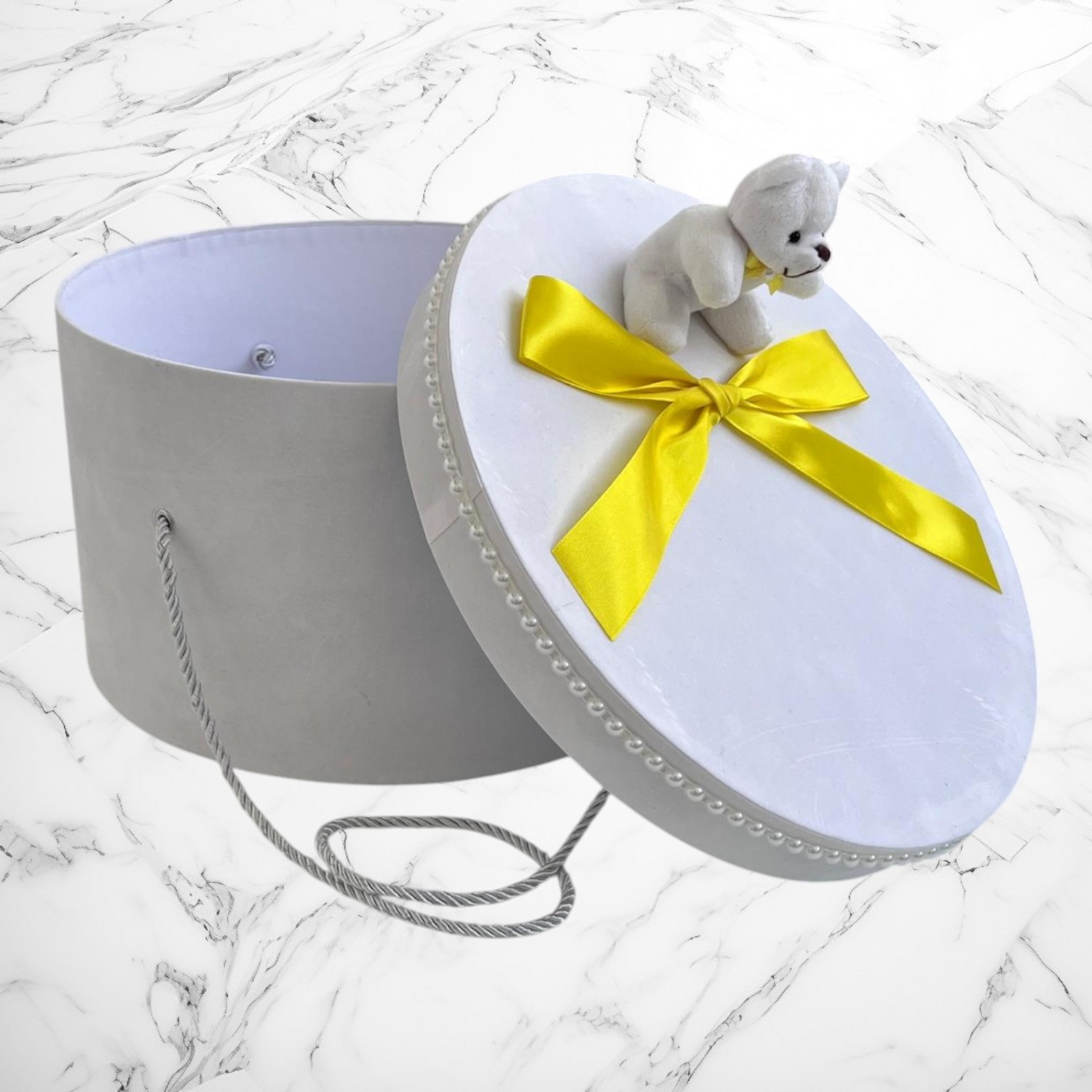 ✨ Cutie trusou – rotundă, de culoare albă, cu un diametru de 33 cm și o înălțime de 20 cm, decorată cu detalii rafinate și un ursuleț drăgălaș, ideală pentru păstrarea amintirilor prețioase.