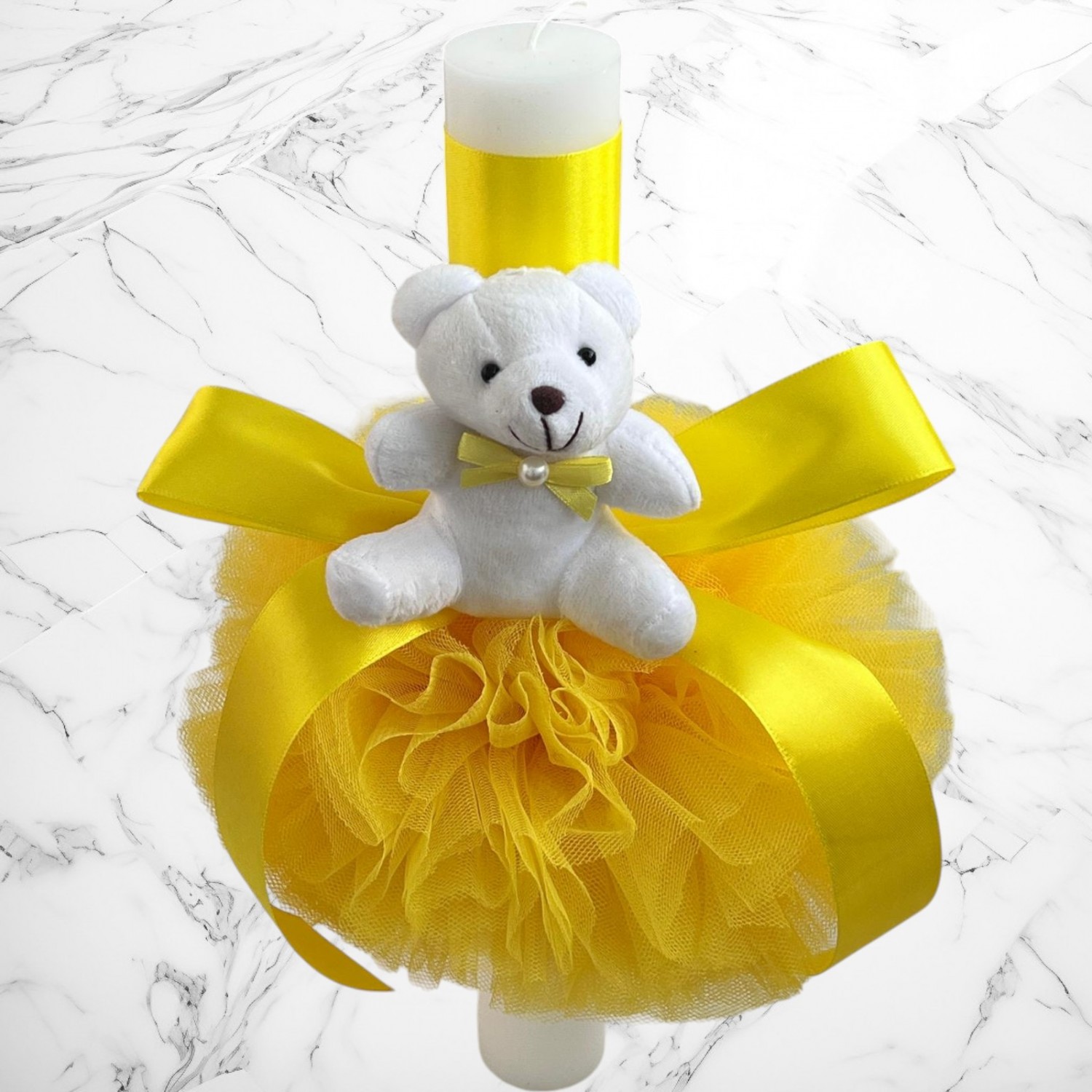 🕯️ Lumânare botez – cu o înălțime de 35 cm și un diametru de 4.5 cm, împodobită manual cu dantelă, fundițe și un ursuleț adorabil, oferind un plus de farmec ceremoniei.