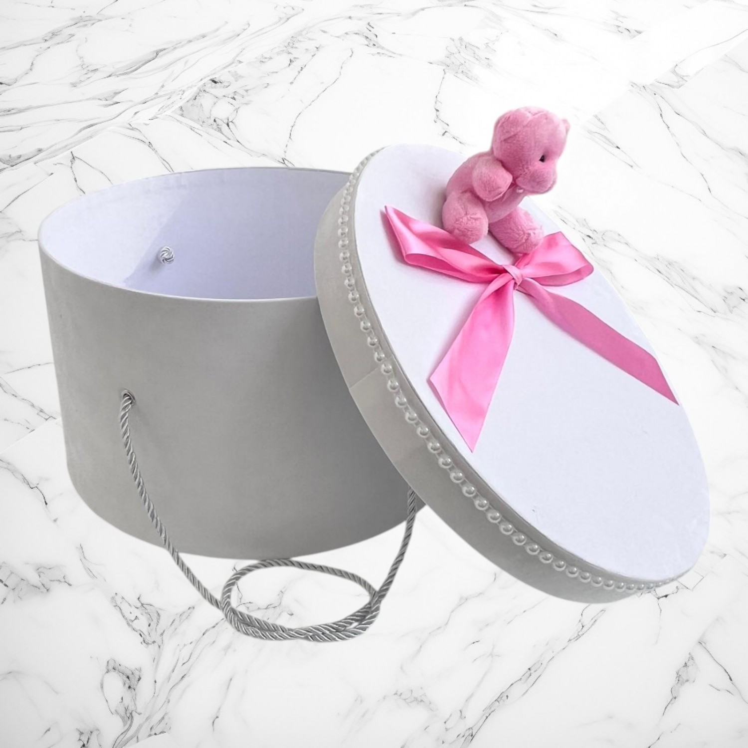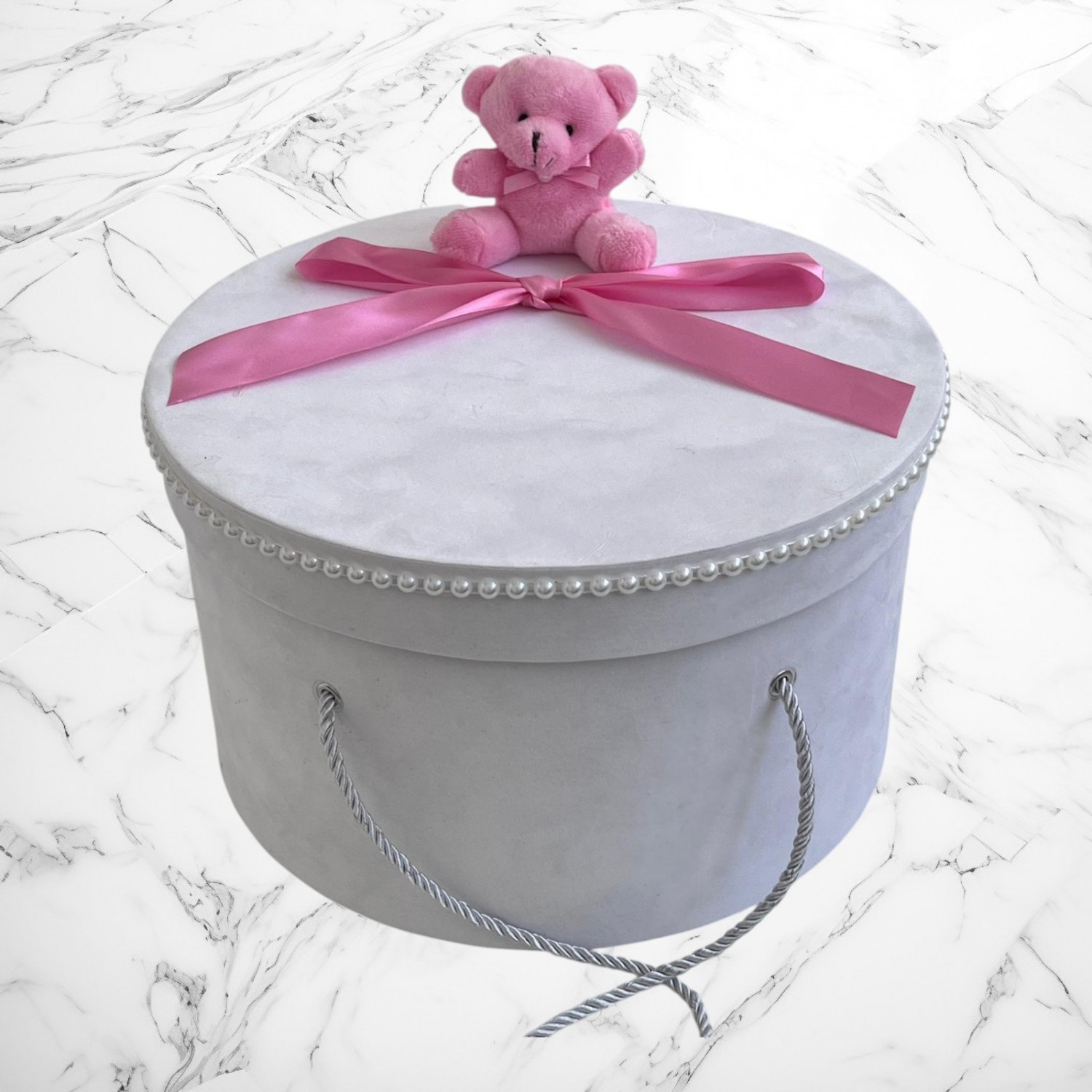 Set botez roz cu ursuleț – Cutie pentru hăinuțe și lumânare