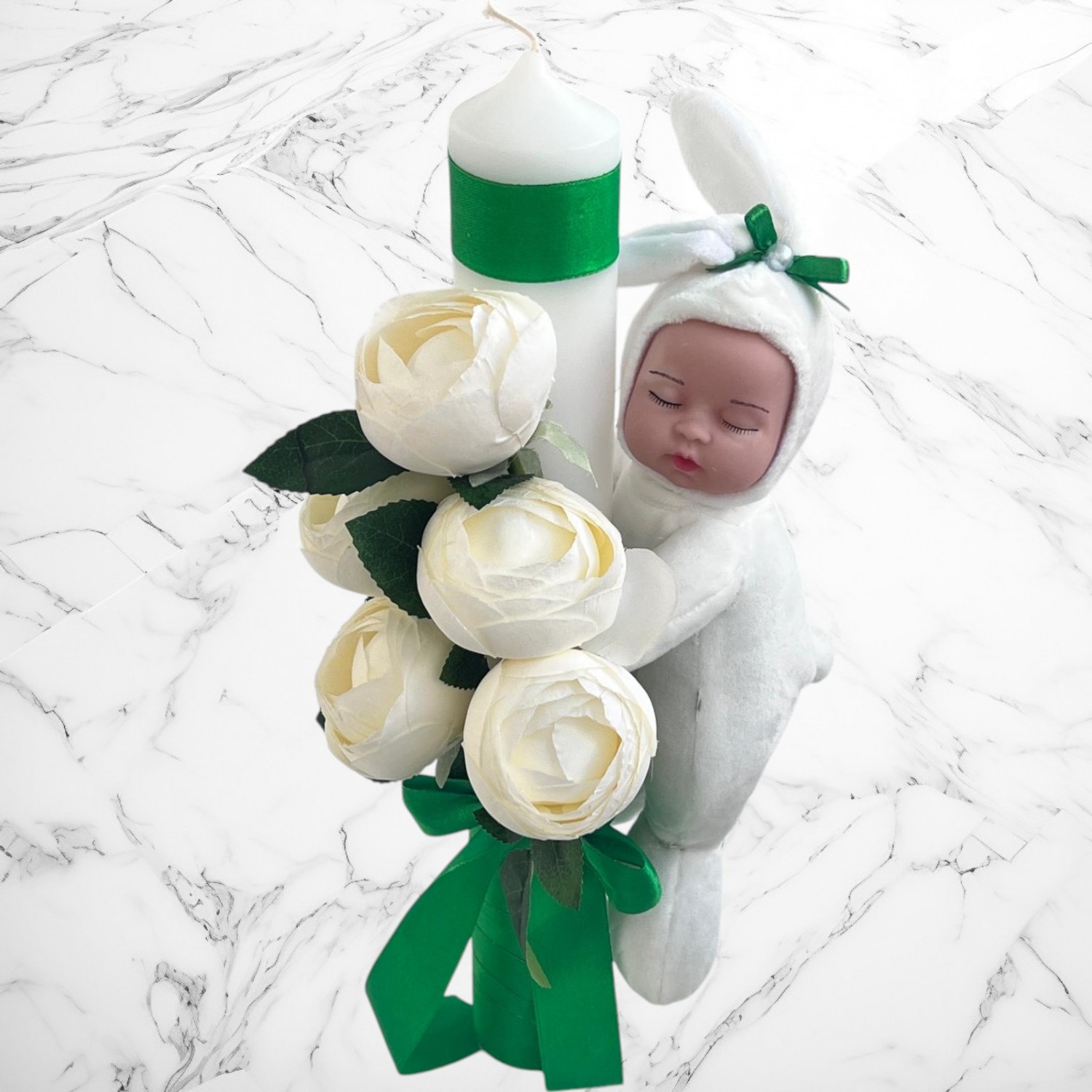 🕯️ Lumânare de botez – cu o înălțime de 35 cm și un diametru de 4.5 cm, împodobită manual cu bujori artificiali, dantelă și panglici delicate, simbolizând puritatea și frumusețea acestui moment unic.