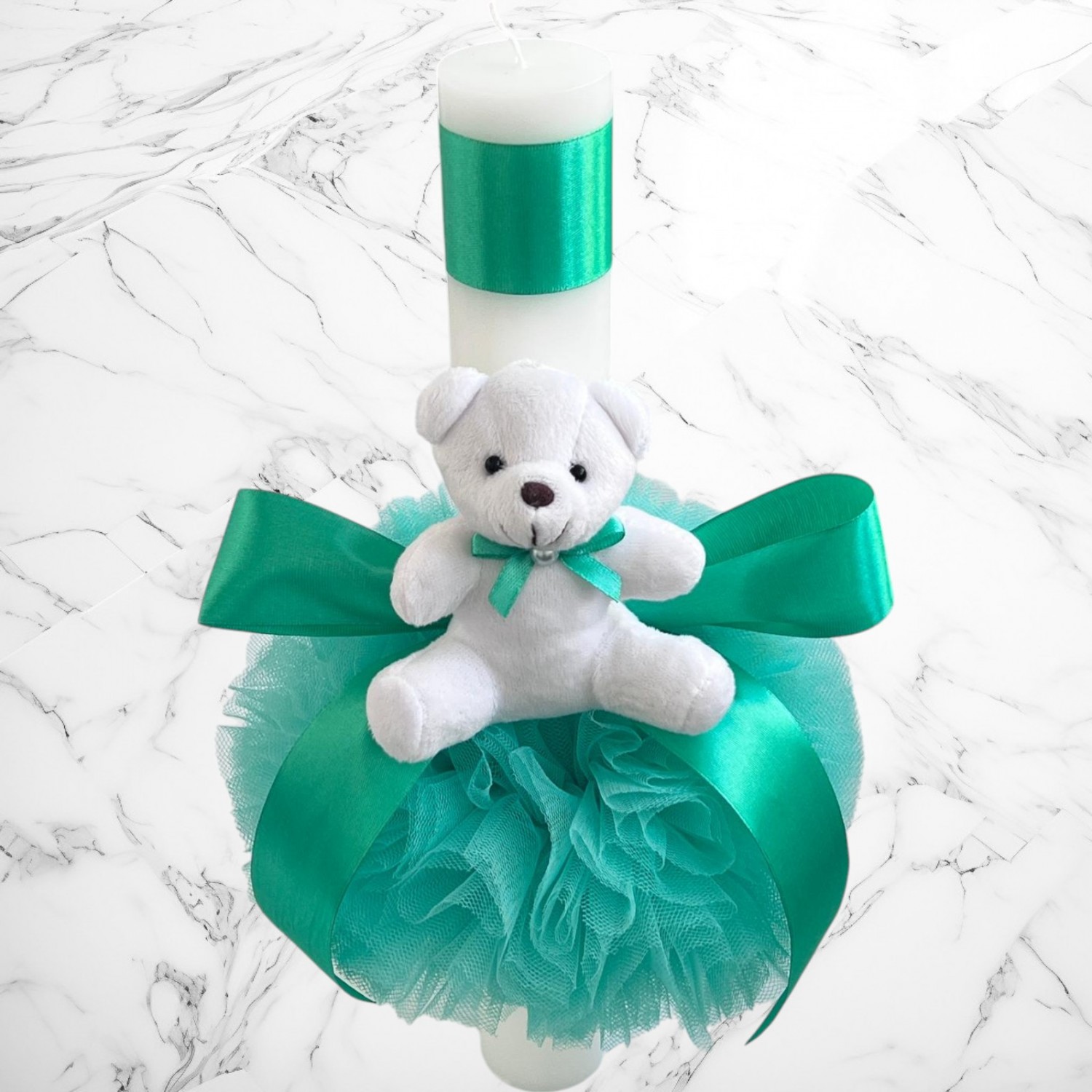 🕯️ Lumânare botez – cu o înălțime de 35 cm și un diametru de 4.5 cm, împodobită manual cu dantelă, fundițe și un ursuleț adorabil, oferind un plus de farmec ceremoniei.