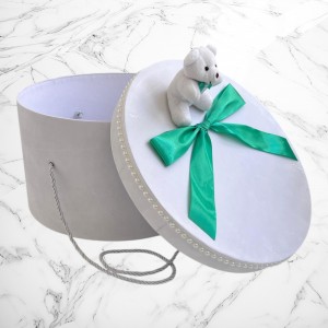 ✨ Cutie trusou – rotundă, de culoare albă, cu un diametru de 33 cm și o înălțime de 20 cm, decorată cu detalii rafinate și un ursuleț drăgălaș, ideală pentru păstrarea amintirilor prețioase.