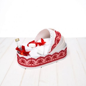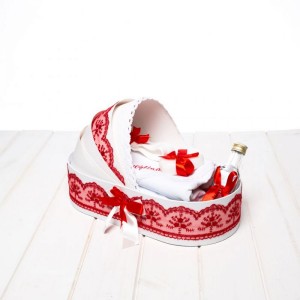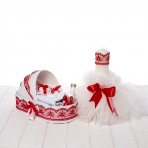 Pentru ziua botezului, nasii unei fetite pot cumpara un trusou botez ambalat in cutie tip landou si o lumanare biserica impodobita cu tulle alb si funda rosie.