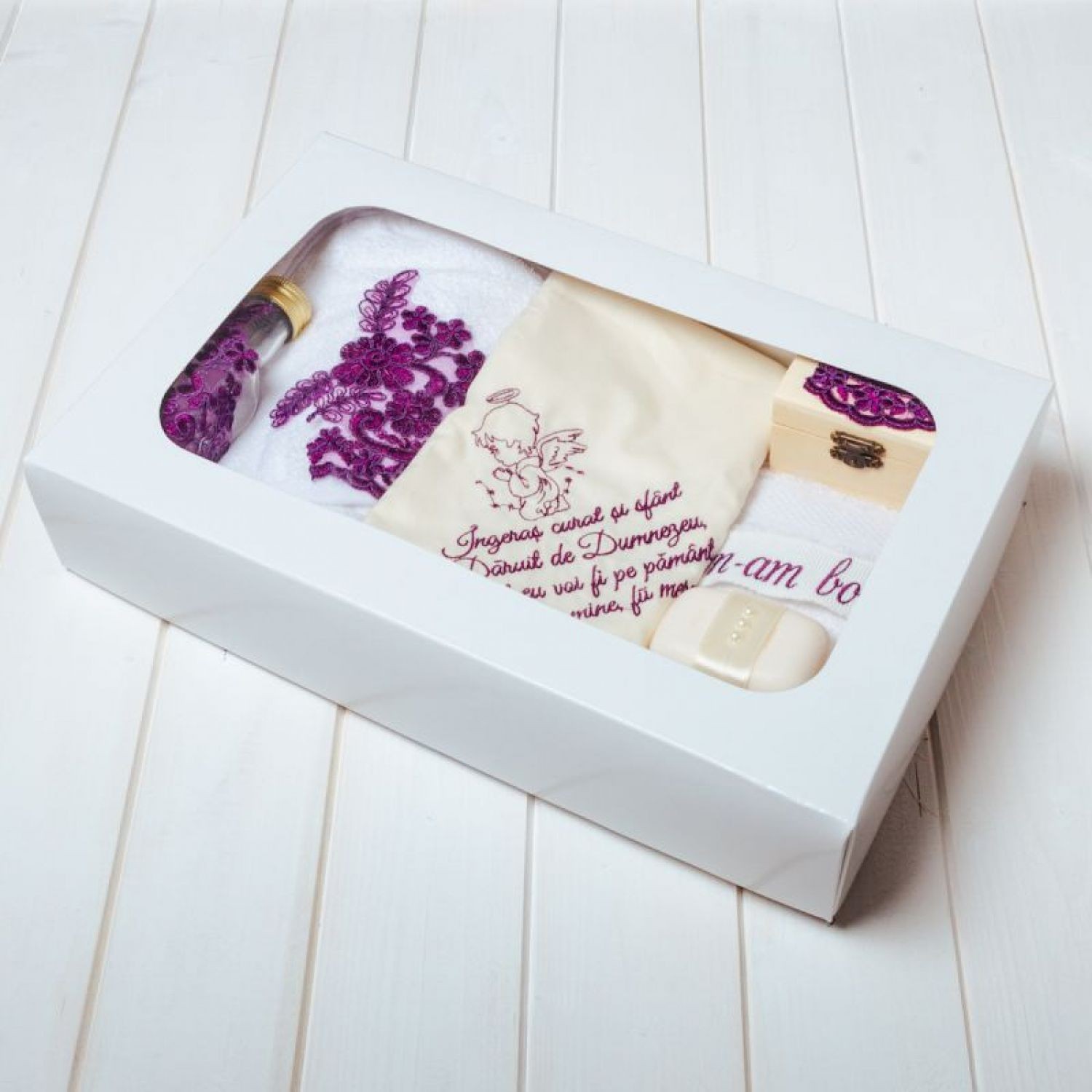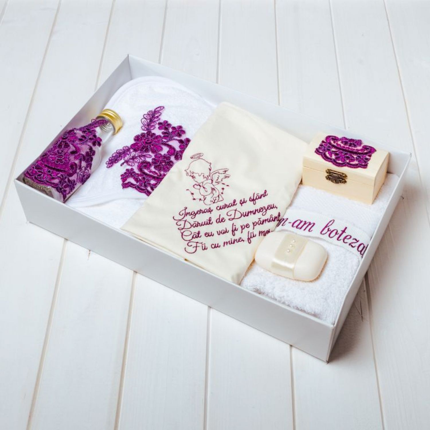 Botezul unei fetite gingase va fi cu atat mai special cu cat nasii de botez aleg pentru fina lor accesorii de biserica mai elegante, cum ar fi un set botez format din lumanare si trusou dantela mov cu rugaciune brodata.