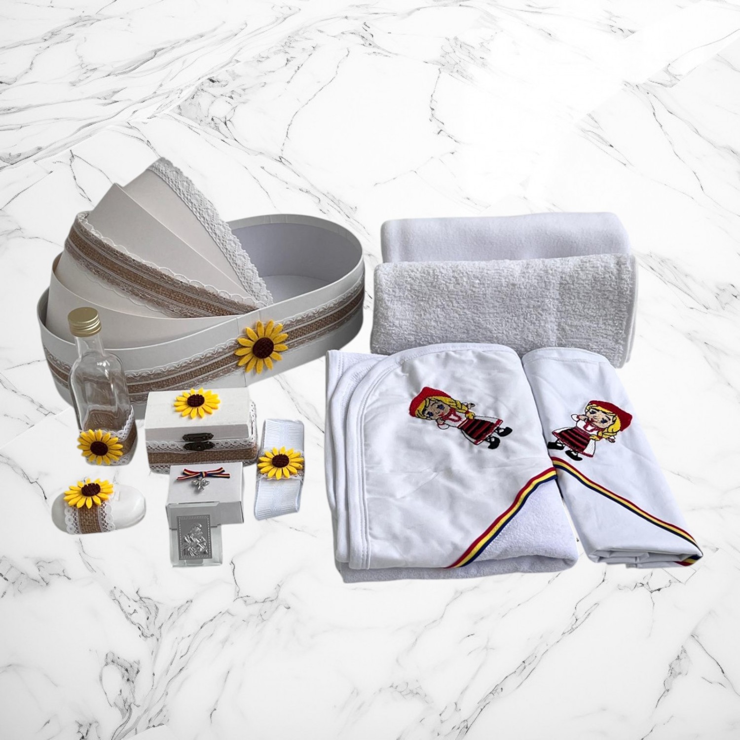 Toate elementele trusoului sunt așezate într-o cutie albă din carton, în formă de landou, decorată cu fundă și perlute