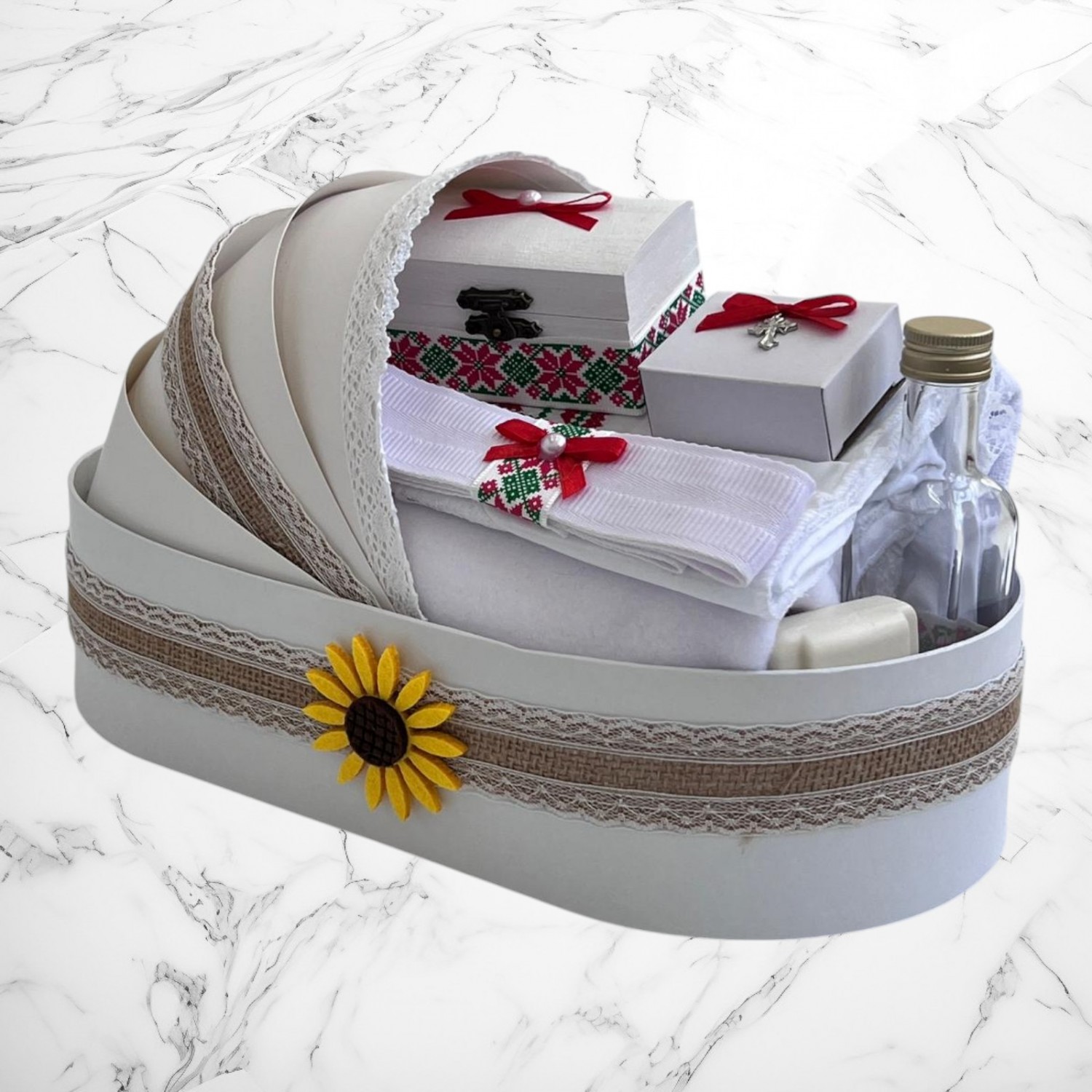 Toate elementele trusoului sunt așezate într-o cutie albă din carton, în formă de landou, decorată cu fundă și perlute