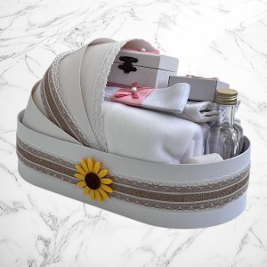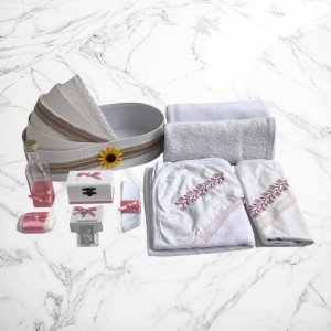 Toate elementele trusoului sunt așezate într-o cutie albă din carton, în formă de landou, decorată cu fundă și perlute