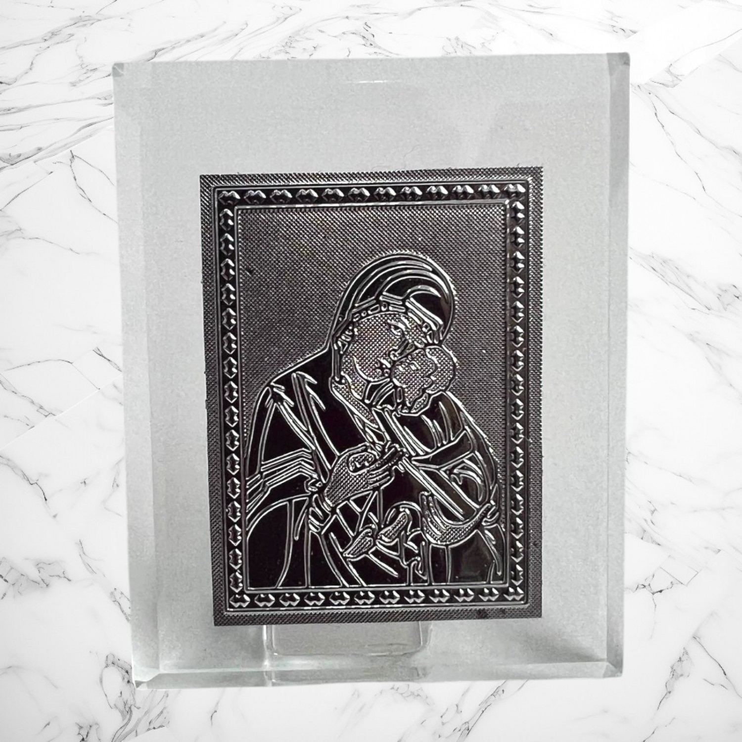 🙏 Mărturie iconiță cu Maica Domnului și pruncul Iisus – realizată din foiță de aluminiu lipită pe sticlă.
