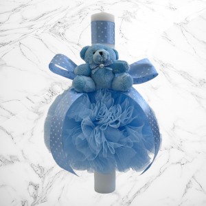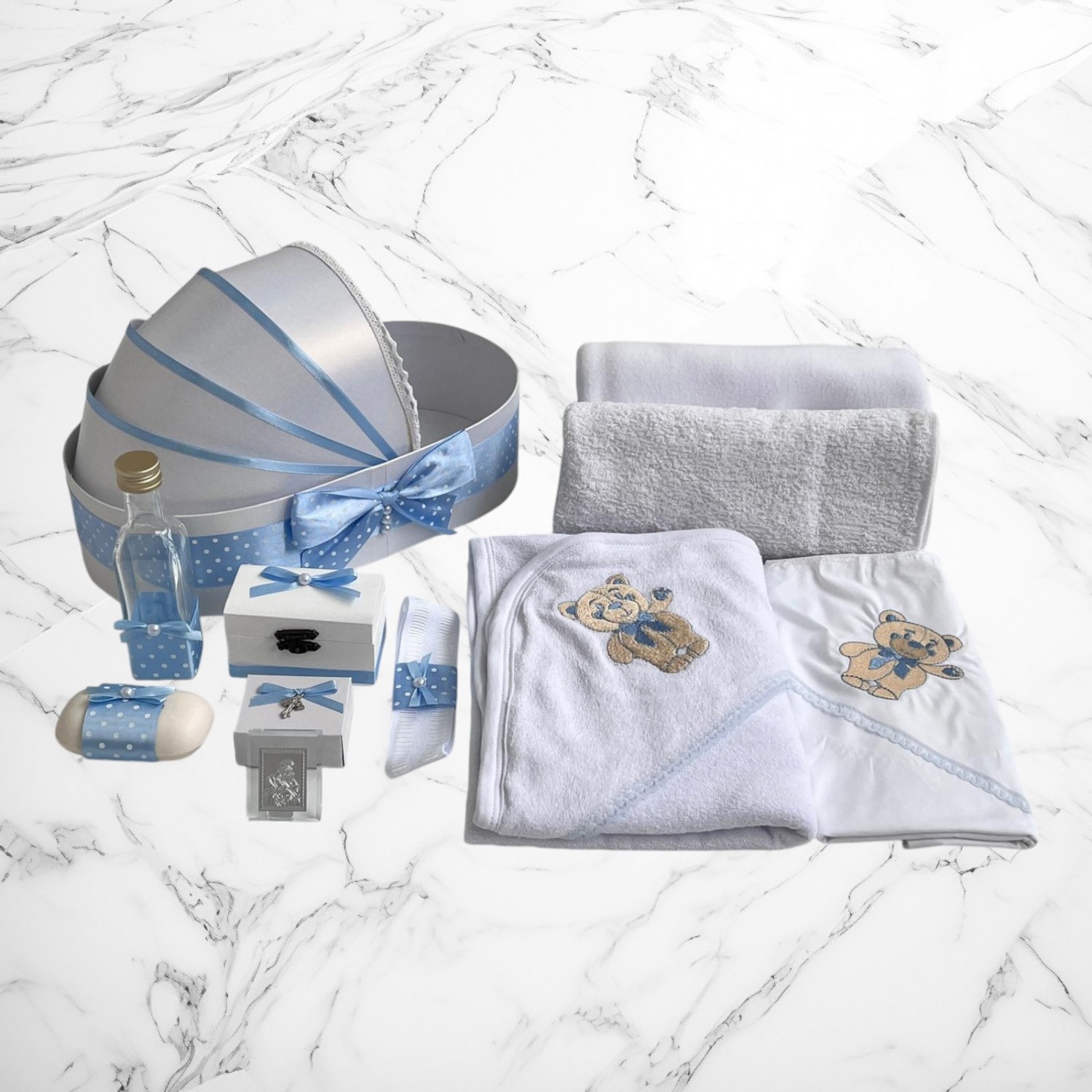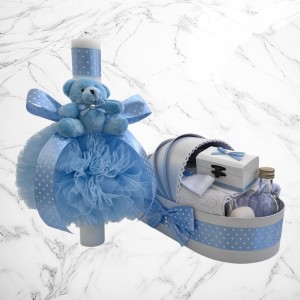 Oferă-i micuțului un botez de neuitat cu setul complet ursuleț bleu cu buline, realizat cu atenție la detalii și eleganță. Setul conține o lumânare decorată cu tulle, fundă satinată și un ursuleț adorabil, alături de un trusou complet pentru ceremonia creștină.